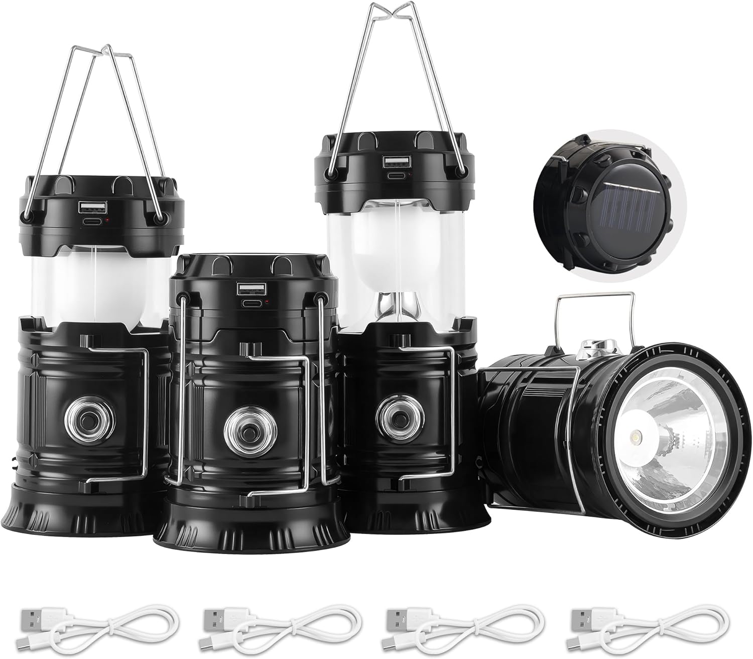 Collapsible Portable Solar Camping Lantern, USB Rechargeable LED Flashlight – Survival Kits for Power Outages Hurricane Supplies Emergency, Indoor & Outdoor, 4-Pack